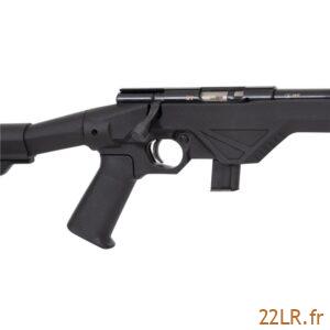 Le calibre reste le 22LR, avec une alimentation par chargeur amovible. La capacité annoncée se décline en 10 coups et aussi en 9+1, ce qui renvoie à la logique chargeur + chambre : on charge le magasin, puis on peut chambrer une cartouche pour partir avec une cartouche en plus prête au tir. Le chargeur amovible simplifie le rechargement et le contrôle de l’arme entre deux séries, un point pratique au stand. La carabine arrive avec 1 chargeur supplémentaire, utile pour préparer deux types de munitions ou simplement gagner du temps sur le pas de tir.
