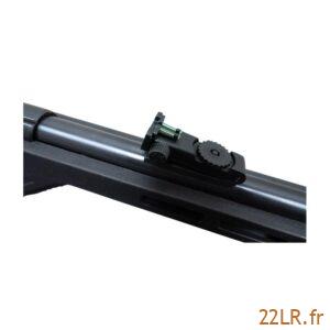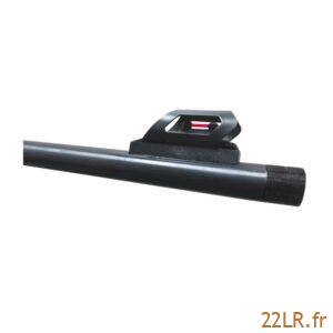 Les organes de visée comprennent un guidon et une hausse réglable. Le réglage de hausse sert à caler le point d’impact à la distance choisie, ce qui évite de “tenir” en contre-visée et améliore la régularité, surtout en tir de précision. Pour aller plus loin en distance ou en finesse de visée, le boîtier reçoit un rail usiné en 11 mm : ce standard accepte de nombreux montages d’optiques dédiés au 22 LR. Le fait que le rail soit usiné sur le boîtier apporte une base propre et répétable pour le montage, à condition de choisir des colliers adaptés au 11 mm.