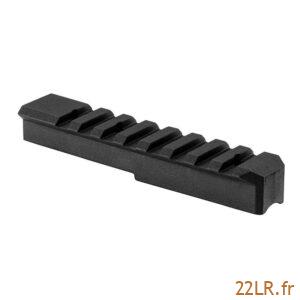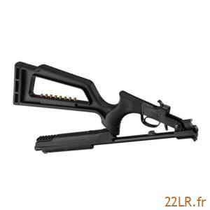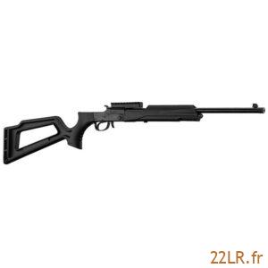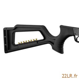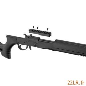 La carabine reçoit une crosse synthétique évidée, pensée pour rester pratique et facile à vivre. À l’avant, elle intègre un rail Picatinny destiné au montage d’un laser ou d’un bipied : le bipied aide à stabiliser l’arme pour du tir posé, et le rail standard simplifie le choix d’accessoires compatibles. Sur le dessus de la carcasse, un rail de 11 mm usiné permet de monter une lunette : ce format “queue d’aronde” reste courant en 22 LR, et l’usinage direct assure un appui propre pour des colliers adaptés.