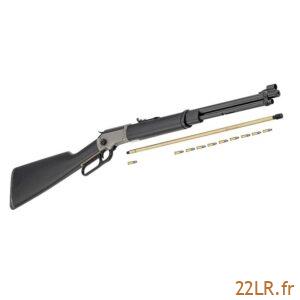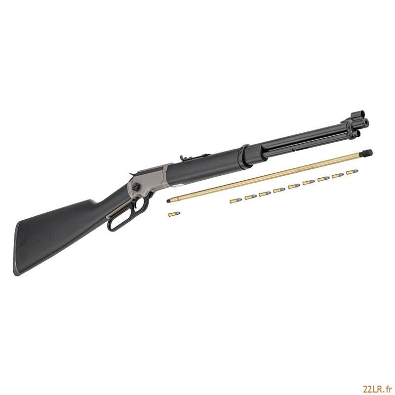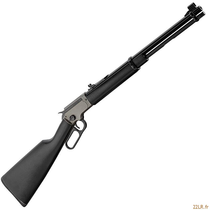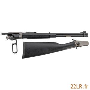 La crosse utilise un matériau synthétique annoncé ultra résistant aux intempéries, un avantage concret si l’arme sort par temps humide ou reste stockée dans un sac. Le texte mentionne aussi une crosse bois noire d’inspiration Far West, librement inspirée des carabines Winchester : visuellement, on reste dans une ligne “western” marquée, avec une teinte noire. La finition bicolore distingue les éléments : noir pour le canon, le tube magasin et le levier, et Cerakote gris métallisé pour le boîtier, un revêtement connu pour bien encaisser les frottements et les manipulations répétées. L’ensemble garde une esthétique contrastée tout en restant orienté vers un usage pratique.