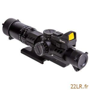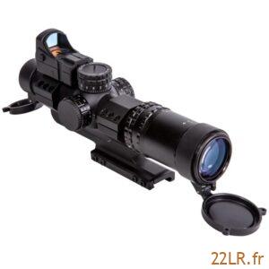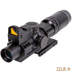 Le kit inclut un mini viseur réflexe Firefield Impact, un support en porte-à-faux et une configuration à double optique orientée engagements à courte et moyenne portée. Cette logique « lunette + point rouge » permet de basculer d’un visuel très proche au grossissement sans toucher à la bague, selon le scénario de tir. C’est aussi un kit lunette 22LR prêt à monter, pratique pour partir sur une configuration cohérente dès la sortie de boîte.