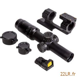 Le kit met l’accent sur la vitesse : la RapidStrike fonctionne en SFP (réticule au second plan focal), et elle reçoit un réticule Circle Dot utilisable en rouge, vert ou noir, avec 5 niveaux de luminosité. Le point central annoncé à 5 MOA privilégie l’acquisition immédiate plutôt que la visée « fine » sur très petit visuel, logique en chasse active ou en parcours type 3-Guns. L’optique profite aussi d’une lentille entièrement multicouche, utile pour conserver une image lisible quand la lumière baisse ou que les contrastes deviennent difficiles.