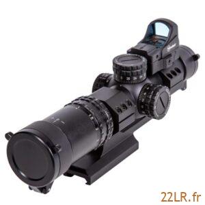 Grossissement 1-4x et objectif de 24 mm : cette plage sert d’abord à garder un champ de vision large à 1x pour les transitions rapides, puis à monter à 4x pour mieux lire une zone ou affiner un tir à moyenne distance. Le tube de 30 mm laisse généralement plus de marge de réglage qu’un 25,4 mm, avec des montages très courants en tir dynamique.