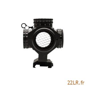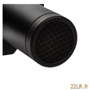 Objectif de 24 mm et verre antireflet multicouche : on obtient une image plus lisible en lumière changeante, avec moins de reflets parasites sur le pas de tir. Le kit ajoute un filtre en nid d’abeille qui aide à limiter l’éblouissement (soleil rasant, éclairage de stand) et à garder le contraste sur la cible.