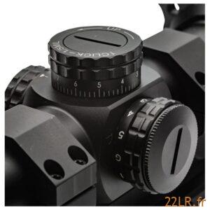 Les tourelles « pop-up » avec verrouillage sécurisent les réglages de dérive et d’élévation pendant le transport ou une séance dynamique: on évite les clics involontaires. La valeur de clic à ½ MOA donne des corrections rapides; à 100 m, chaque clic déplace l’impact d’environ 14,5 mm, ce qui colle bien à un usage proche/moyenne distance plutôt qu’au micro-réglage de benchrest. Cette lunette pour 22LR reste donc orientée vitesse et polyvalence.