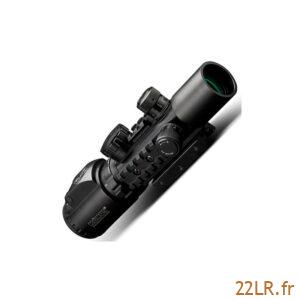 Second plan focal Réticule gravé Grand angle 100% purgée à l’azote Traitement multicouches Etanche et anti-choc 5 niveaux de réglage lumineux Niveau à bulle lumineux Base réversible s’adaptant sur rails Weaver/picatinny et .22 Caractéristiques : • Grossissement : 2-6x • Objectif Ø (mm) : 28 • Diamètre du tube (mm) : 34 • Réticule : Mil-dot gravé • Poids (g) : 560 • Longueur (mm) : 212 • Champ de vision à 100 m (m) : 18–7.3 • Ajustement par clic à 100m (MOA) : 1/4 • Parallaxe réglable : Oui • Distance de réglage de la parallaxe (m) : 10 – ∞ • Calibre maximum supporté : .300 WM